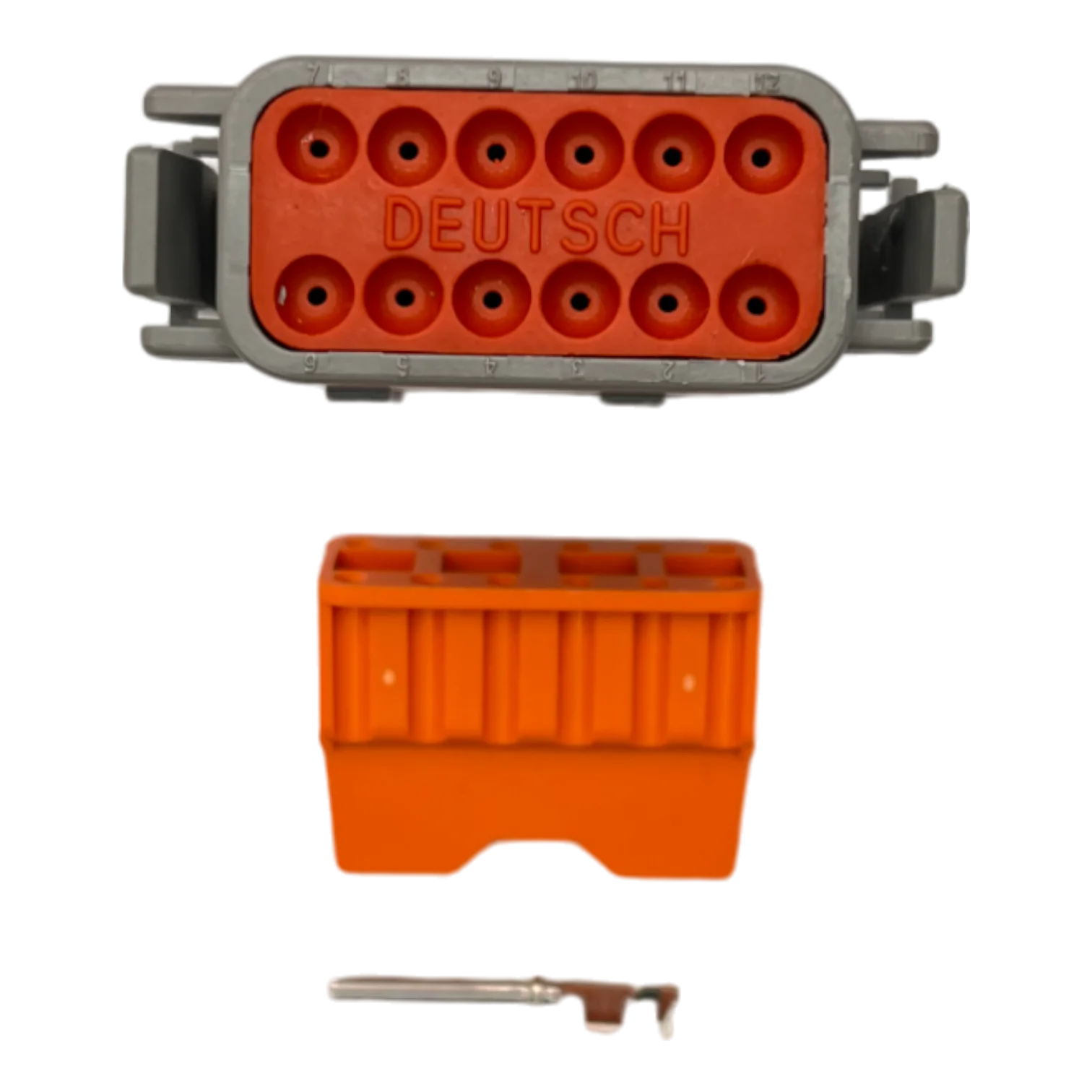 Para un diagnóstico electrónico automotriz preciso, el técnico debe entender que el conector DTM06-12S es un sistema modular. La carcasa del enchufe incluye los sellos, pero para un ensamble funcional se requieren los doce terminales tipo socket (hembras) de la serie DTM y la cuña de bloqueo (wedgelock) de color naranja (WM-12S). La cuña es el componente de seguridad que garantiza que los terminales no se retrocedan bajo tensión mecánica o vibración intensa del motor Cummins. Utilizar terminales originales con recubrimiento de níquel es fundamental para evitar la resistencia eléctrica y asegurar la longevidad del contacto en ambientes húmedos.